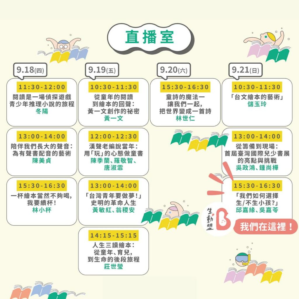 錯過的、沒辦法到現場的朋友不用擔心,本週日(09/21)下午03:30-04:30還有一場線上直播,由理事嘉緣和嘉苓和大家在 臺灣國際兒少書展官方粉絲專頁直播對談「我們怎麼選擇生/不生小孩?」